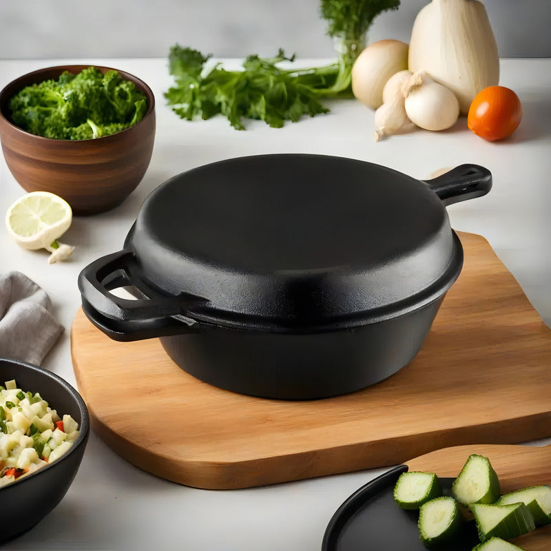 Increíble juego de cacerola + sartén de hierro fundido + 2 protectores de mango de silicona, ideal para sorprender a tus invitados con recetas especiales. También podrás utilizarlo para preparar masa madre para pan. Bonito diseño color negro. Fácil uso y cuidado. Asombroso juego de cacerola/sartén de hierro fundido que le hará la vida más fácil y práctica. Este combo puede convertirse en lo que desee: una cacerola profunda, una freidora, un horno holandés y la sartén puede convertirse en tapa para funcionar como horno o simplemente usarse como plancha. Piezas versátiles que permiten la preparación de casi cualquier receta. Ideal para cocinar al aire libre ya que por su material de hierro fundido tendrá una conducción y retención térmica más eficiente. Este juego tiene un diámetro de 26 cm. Diseño color negro. Se recomienda lavar a mano con agua y jabón suave, secar inmediatamente con toalla y colgar o guardar en lugar seco. Procura curar tu cacerola + sartén. Una vez lavado y al dejarlo bien seco: 1. - Agrega una capa muy fina de aceite de cocina a toda la superficie de su hierro fundido con un paño o una toalla de papel sin pelusa. Ten cuidado con el aceite: solo necesitas una capa delgada, no lo suficiente como para gotear cuando lo inclinas. Las capas delgadas son importantes para hornear la cacerola y el sartén 2. - Pre-calienta el horno a 230-250º. Coloca papel de aluminio en la rejilla inferior del horno para recoger el exceso de aceite. Coloca los utensilios de cocina boca abajo en la rejilla central. Esto ayuda a evitar que el aceite se acumule en la superficie de cocción. Hornea por 1 hora. 3. - Apaga el fuego y deja que la cacerola y sarten de hierro fundido se enfríen en el horno. Esto permite que se cure y se adhiera aún más a la plancha. Como restaurar una cacerola o sartén de hierro: Antes que todo, esto es muy normal que pase y puede pasarte más de una vez. ¡Es fácil! 1. En el caso de óxido, fregar con abundante vinagre, aclarar y volver a fregar con detergente normal. Luego, lava la cacerola con agua tibia y jabón. Este paso puede eliminar porciones del curado, pero está bien porque nos estamos preparando para volver a curar la cacerola. 2. - Seca completamente tu cacerola de hierro fundido con una toalla de papel o un paño sin pelusa. Debe estar completamente seco. 3. -Aplica nuevamente el proceso de curado expuesto en proceso para curar cacerola y sartén. USO: Para usarla puede usarlas cada una por separada o juntas imitando la función de un horno. Se recomienda pasar una fina capa de aceite vegetal cuando se está calentando. Luego preparar cualquier receta de su preferencia. Especificación: FORMA: redonda COLOR: Negro Material del cuerpo: Hierro Material del mango: Hierro + Protector Silicona Largo x Ancho x Altura: 43 cm x 26 cm x 13 cm Diámetro: 26 cm ALTURA CACEROLA: 8cm ALTURA SARTEN: 4 cm Lista de productos: Ø26cm Sartenes Hierro Fundido 8cm * 1 Ø26cm Sartenes Hierro Fundido 4cm * 1 Grip * 2